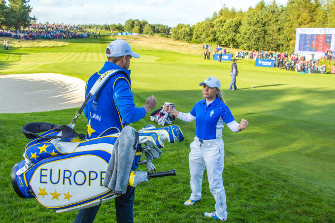 English rookie, Bronte Law, was the first to grasp the moment when she won both the 16th and 17th to beat McDonald 2 & 1 and then seconds later, up ahead at the last, controversial captain’s pick Pettersen, a veteran with eight previous Solheim Cup appearances behind her, holed a ten-foot birdie putt to beat Alex and secure what was one of the most dramatic victories in the history of the game.