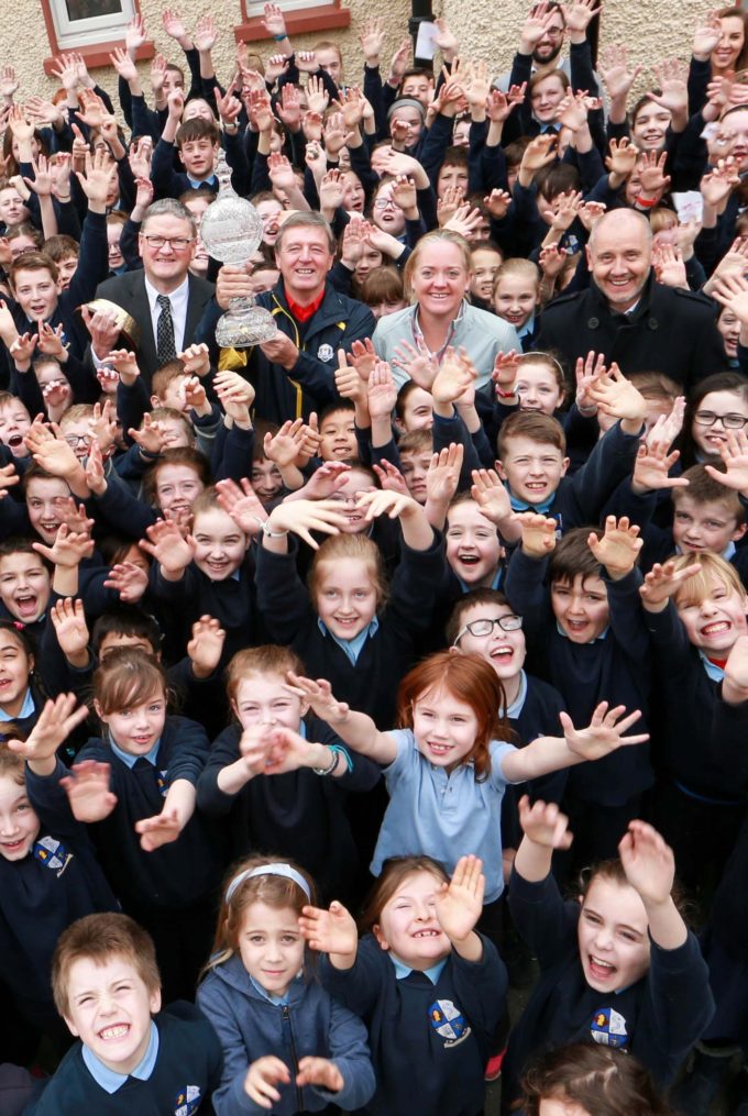 The children of St Itas Primary School in Belfast, pictured with Brian McIlroy of the Rory Foundation, Antonia Beggs from the European Tour and Dubai Duty Free Golf Ambassador Des Smyth, will certainly be Roaring for Rory following the launch of a nationwide competition organised by the Dubai Duty Free Irish Open hosted by the Rory Foundation.