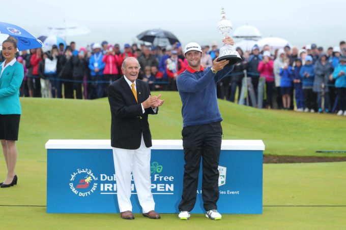 Jon Rahm of Spain receives the trophy from Colm McLoughlin the Executive Vice Chairman and CEO of Dubai Duty Free after his victory at the Dubai Duty Free Irish Open at Portstewart G.C. July 9, 2017 (Photo by Warren Little/Getty Images)