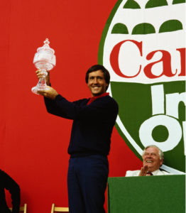 Spanish golfer Seve Ballesteros with the trophy after winning the Carroll’s Irish Open at the Royal Dublin Golf Club, Dublin, Ireland, 1986. (Photo by Simon Bruty/Getty Images)