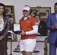 From left: Her Royal Highness Princess Lalla Meryem, Ariya Jutanugarn, winner of the Lalla Meryem Cup and His Royal Highness Prince Moulay Rachid, President of the Hassan II Golf Trophy Association