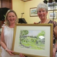 Carol Redpath with first prize which was a beautiful painting by local artist Alison McKnight.