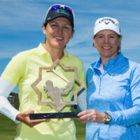 20/05/2019. Ladies European Tour 2019. La Reserva de Sotogrande Invitational, La Reserva Club de Sotogrande, Sotogrande. Spain 16-19 May 2019. Celine Herbin of France with her trophy and Annika Sorenstam, Host of the tournament. Credit: Tristan Jones