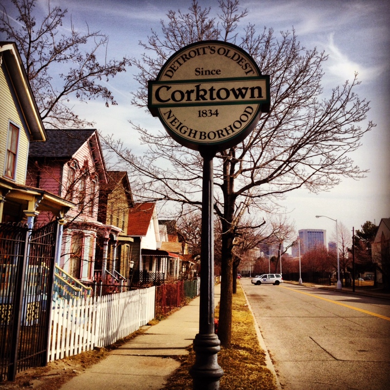 Our first stop was the historic district of Corktown. A tall vintage style street sign tells that you have arrived in Detroit’s oldest neighbourhood. Some of Corktown’s earliest residents were Irish immigrants who fled to Detroit after the potato famine in 1849.