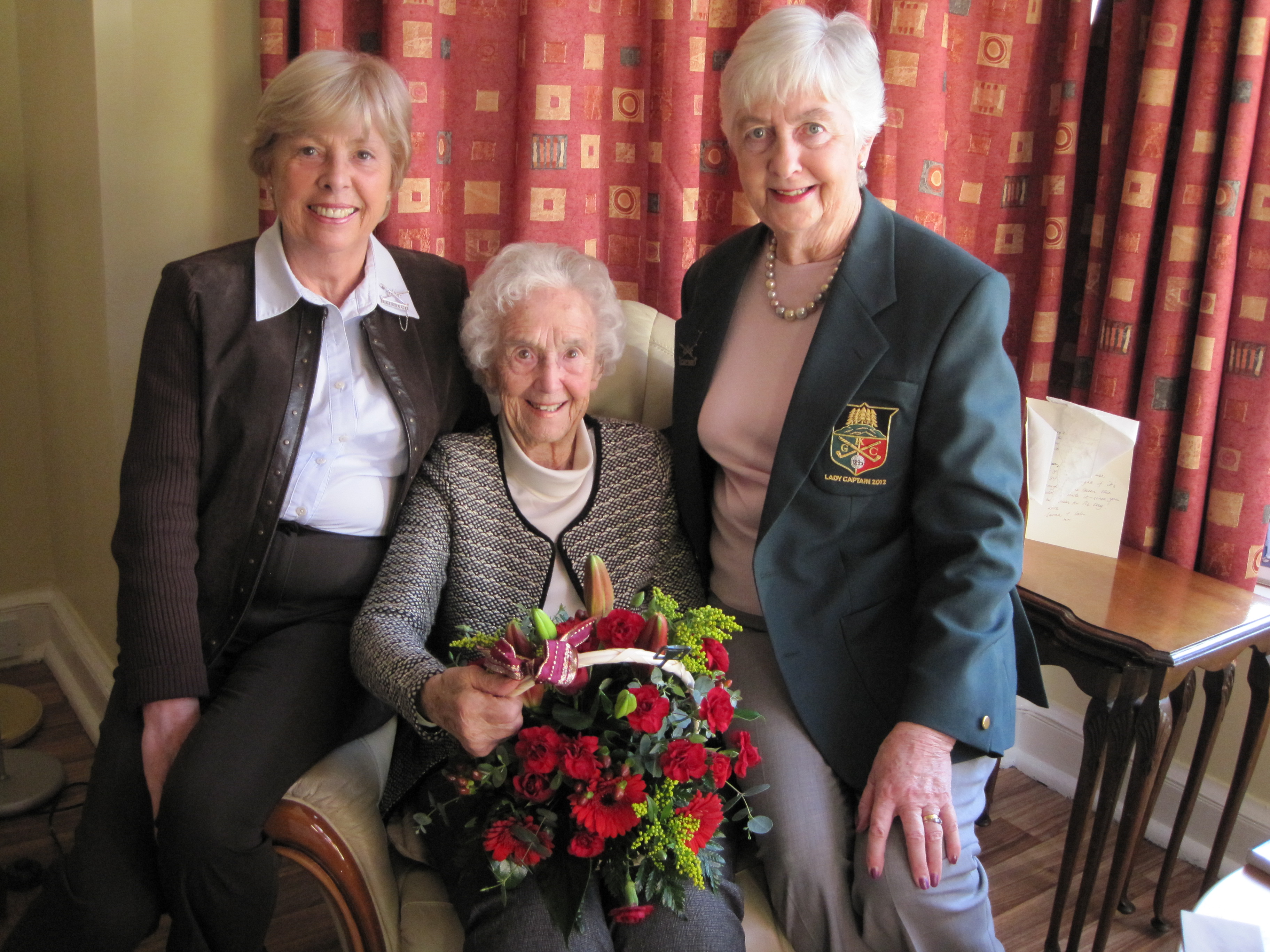 Mrs Eileen Waddell (centre) being presented with flowers on the occasion of her 100th birthday by Knock Golf Club’s Lady President Mrs Janette Davidson (left) and Lady Captain Mrs Maureen Wilson (right).