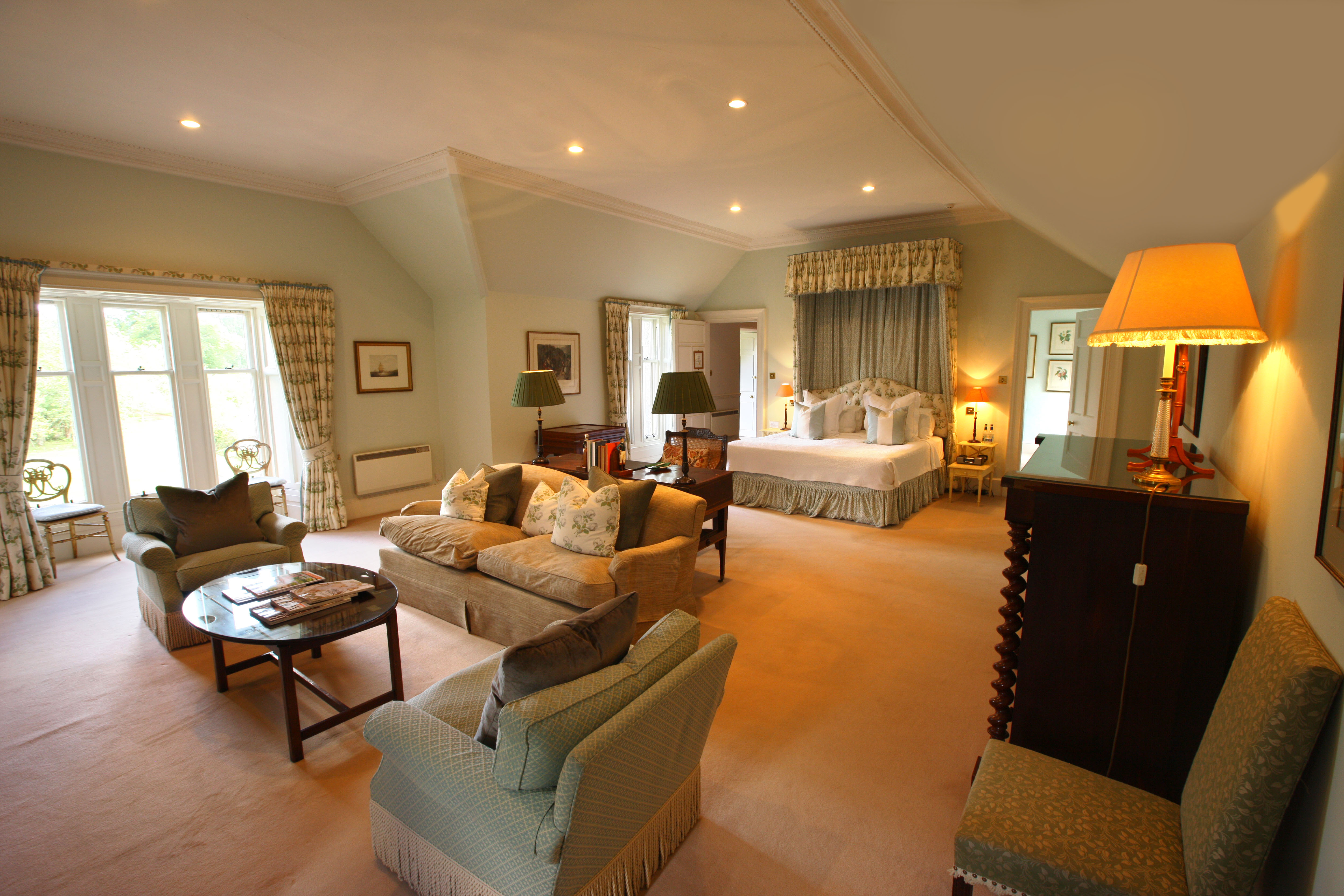 The hotel’s elegant and spacious ensuite bedrooms, while redolent of the past are all fully up to date with present technology including, flatscreen TV and satellite channels, ipod stations and wifi. Many of the rooms in the house have been individually designed by the Duchess, who is a designer in her own right.