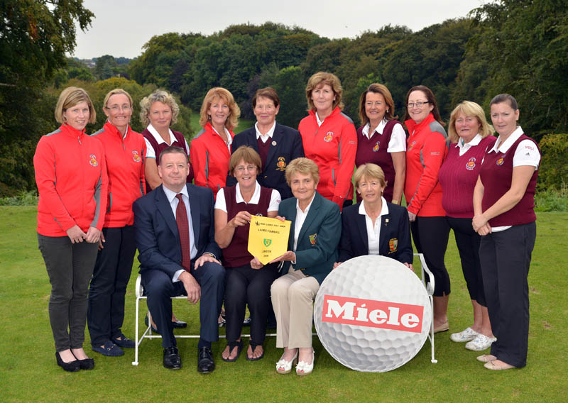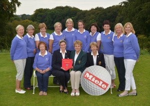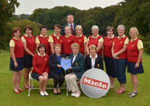 Photo:Vonnie Noonan (ILGU Board Member) presenting Sylvia Alcock (Lady Captain, Skerries Golf Club) with the 2014 Miele All Ireland Ladies Interclub Fourball Regional Final pennant after their victory at Athlone Golf Club. Also in the picture in front are Pat McGrath (Miele Ireland) and Lily O’Sullivan (Lady Captain, Athlone Golf Club). At back (from left) Tara Duggan, Barbara Ryan, Mary Kenny, Joyce Gillespie, Christine O’Brien (Lady President, Skerries Golf Club), Bridgeen Kiernay, Grainne O’Connor, Joanne Kinsella, Nuala MacMahon (Team Manager) and Fiona Farrell, Picture by Pat Cashman