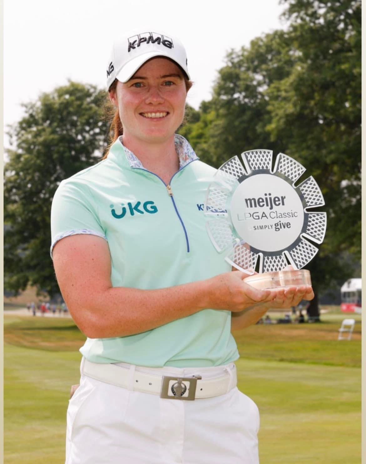 Leona Maguire poses with the Meijer LPGA Classic trophy at Blythefield Country Club in Grand Rapids, Michigan